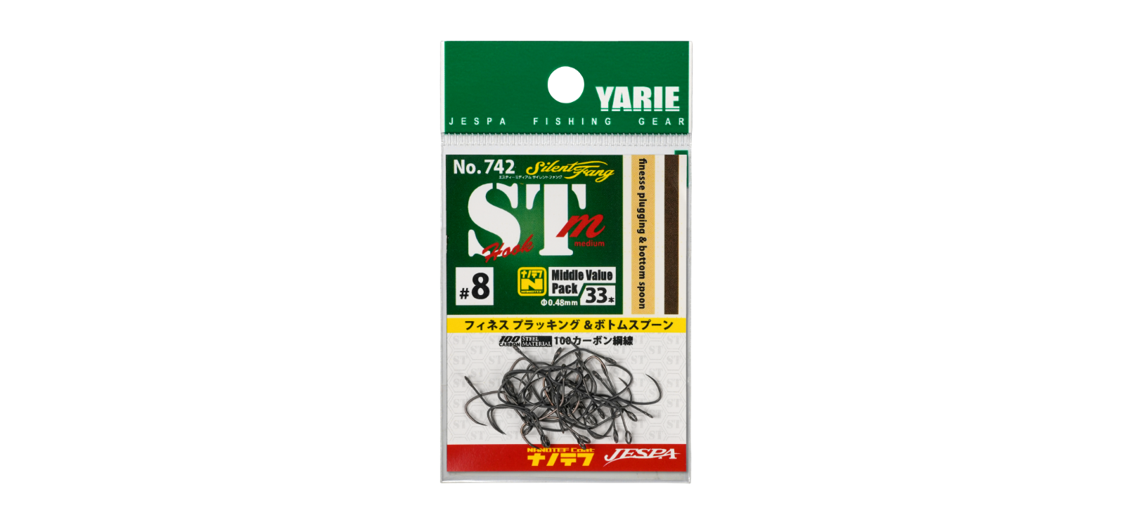 A hook has been perfected that builds on the excellent penetration of the ST series while pursuing even higher hooking performance. Designed for today’s cranking and floating-minnow techniques, it targets short bites that occur with almost no line tension—capturing the fish in that split second. Nicknamed the “Silent Fang”, this hook is already hooking the fish the moment it strikes, and is sure to shine in tournament scenes for years to come.